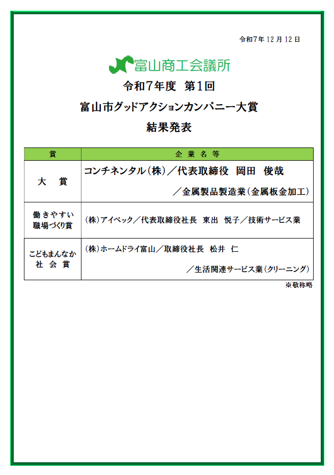 「第1回富山市グッドアクションカンパニー大賞」において、大賞を受賞いたしました。
